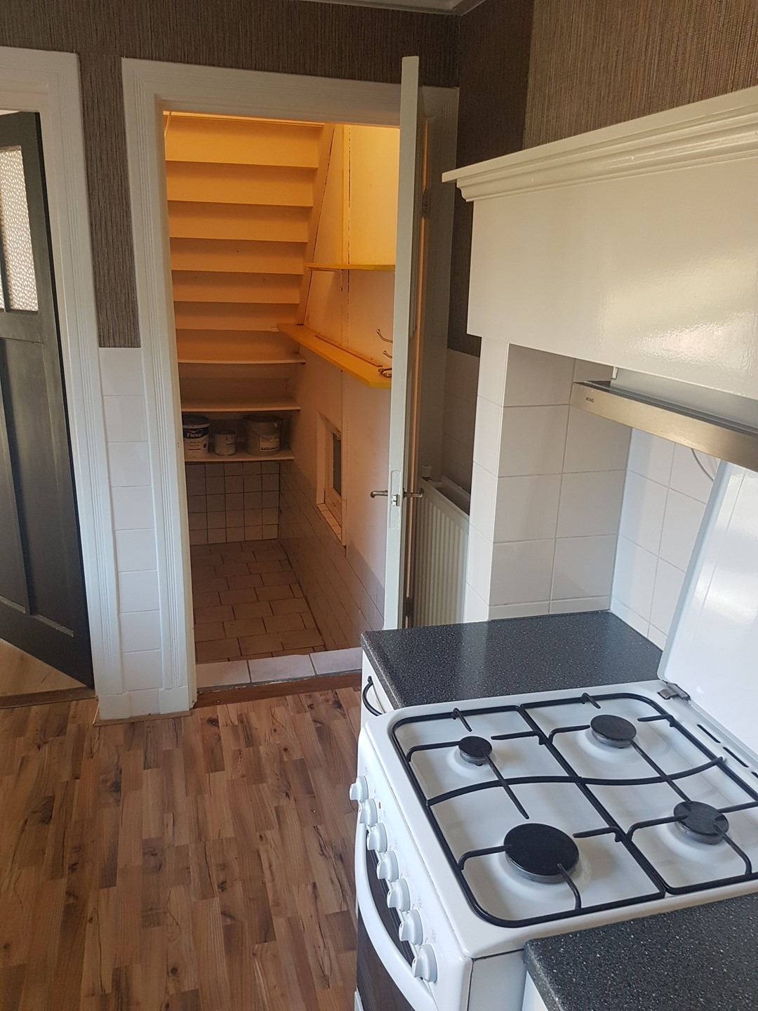 Vanuit de woonkamer te bereiken gesloten keuken met gasfornuis inclusief oven, afzuigkap, vaatwasser en ruime kelderkast. Aansluitend de bijkeuken met toilet met fontein en ruime inbouwkast. De bijkeuken geeft toegang tot de tuin met vrijstaande schuur.