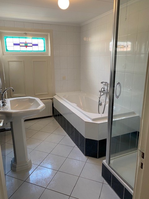 Overloop met 3 ruime slaapkamers met inbouwkasten, nette badkamer voorzien van ligbad, douche, toilet en wastafel.