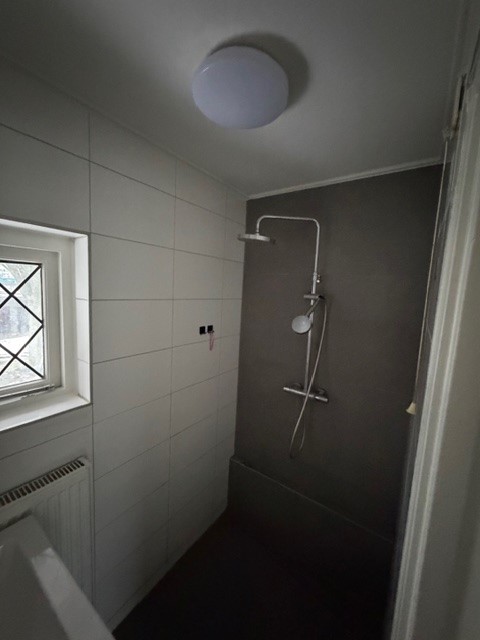 Overloop met toegang tot drie slaapkamers, badkamer voorzien van een inloopdouche en wastafelmeubel.