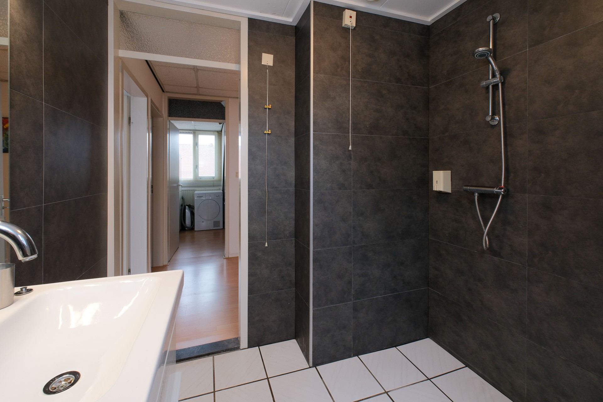 Overloop, 3 slaapkamers en een ruime badkamer met douche, wastafelmeubel en toilet.